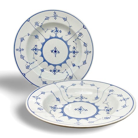 To fine gamle tallerkener fra Aluminia / Københavns Fajancefabrik. 19 cm Ø. Muselmalet. Fin stand med alderssvarende brugsspor. Ingen skår eller afslag. 30 kr pr stk. Sender gerne. Du kan også hente i Fredensborg eller København.