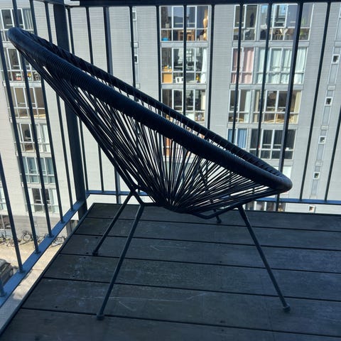 Acapulco stol i sort plast med metalstel. Stolen har det karakteristiske dråbeformede sæde med spændte plastsnore og trebenet metalunderstel. Velegnet som loungestol til indendørs eller overdækket udendørs brug. Sædet er udformet, så det giver en let, åben konstruktion med god ventilation. Neutral sort farve, der passer ind i mange typer indretning.