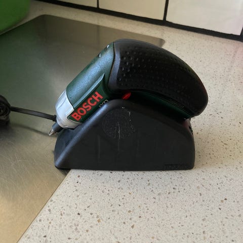 Bosch IXO lille batteridrevet skruemaskine med lader og bits-holder til mindre skrueopgaver. Kompakt akku-skruemaskine med gummibelagt håndtag. Bits placeret i holder på ladestation. Kan monteres med Bosch proptrækker. I original metalæske