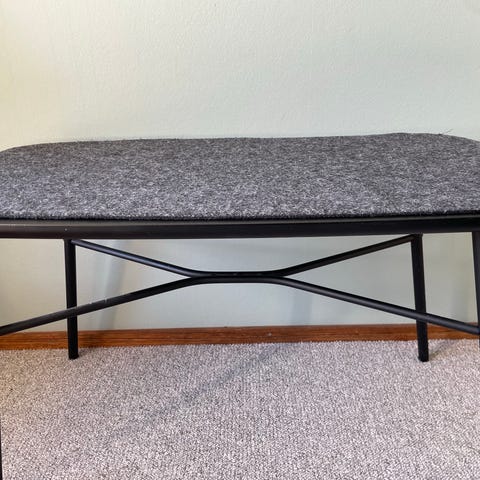Bænk i stof og bambus med polstret sæde i grå tekstil og underhylde i bambus. Mål ca. B90 x H45 x D34 cm. Velegnet som siddeplads og opbevaringsplads i for eksempel entré, soveværelse eller stue.
