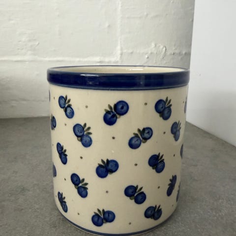 Vil kalde den en bulgarsk tagene. Ovnfast. Håndlavet og håndmalet. Højde incl lyd g ca 19 cm og diameter i top ca 26 cm. Har et lille ubetydelig hak i kant - se billeder. Ubrugt