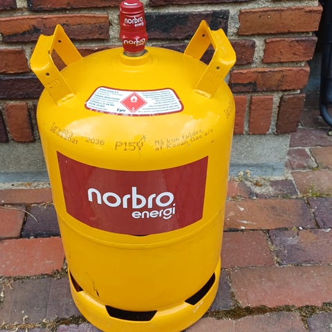 Gasflasken er ikke helt fuld, men der er noget i og den ombyttes mod betaling hos gasforhandler, når den er tom.