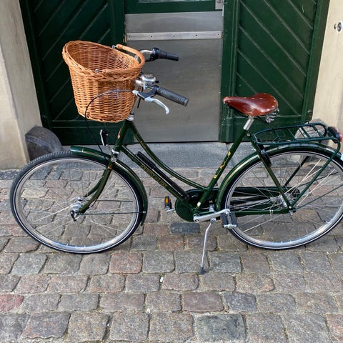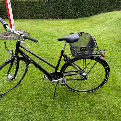 Klassisk grøn Raleigh dame Tourist de Luxe, med 7 indvendige shimano Nexus gear, fodbremse og indvendig tromlebremse på forhjulet.