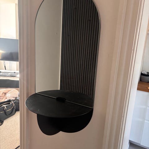H&M Home spejlsæt bestående af et rundt bord-/makeupspejl på stativ og et rundt spejl på bakke med lav kant i guldfarvet metal. Sættet kan anvendes på badeværelse, soveværelse eller entré til spejling og som dekorativ opbevaring eller display af mindre genstande som smykker, parfume eller andre pyntegenstande.