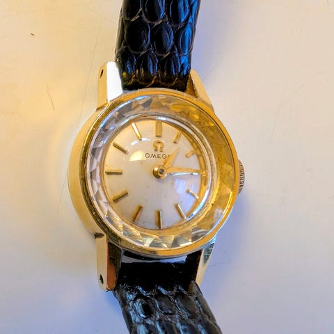 Omega dameur med rund, guldfarvet urkasse og lys skive med markeringer. Uret har sort rem, der fremstår som læder- eller læderlignende materiale. Analog visning med time- og minutvisere. Velegnet som klassisk armbåndsur til kvinder til daglig brug eller mere formelle anledninger.