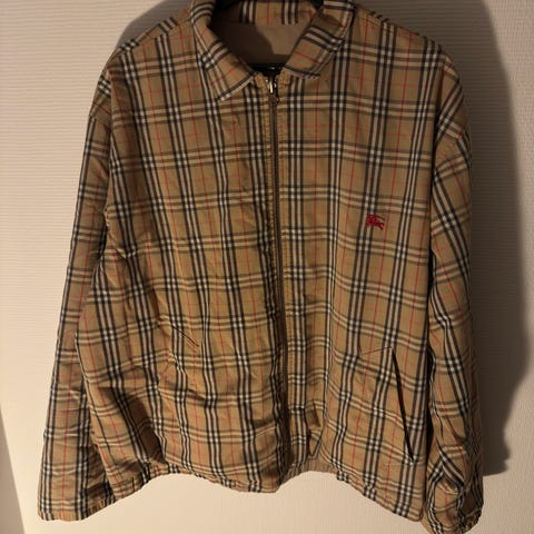 Vintage Burberry lumberjacket til herre i størrelse S/M. Jakken er fremstillet i dådyrfarvet ruskind med klassisk ternet foer og stiklommer. Længde ca. 67 cm.