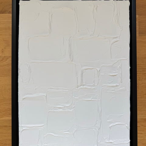 Abstrakt relief kunstværk på hvidt lærred. Billedet består af en kraftig, struktureret reliefform i midten af lærredet, udført i hvid masse, der giver en tredimensionel overflade. Værket er holdt helt i hvidt og egner sig som vægdekoration i fx stue, gang eller kontor, hvor man ønsker et enkelt, men struktureret udtryk. Materiale og kunstner er ikke angivet.