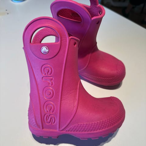 Crocs børnestøvler i størrelse 24 til unisex. Støvlerne er gule og fremstillet i det karakteristiske Crocs-skumplastmateriale. De har udskårne håndtag øverst, som gør dem nemme for barnet at tage af og på, samt en mønstret ydersål for bedre fodfæste. Velegnet som regn- eller gummistøvler til hverdag og udendørs leg.