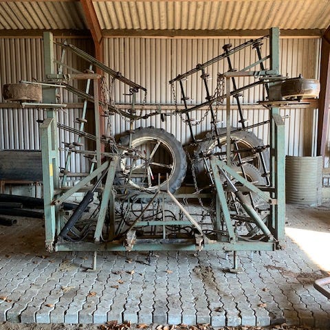 Doublet Record harve til traktor. Redskabet er en markharve med flere rækker fjedertænder og bagmonteret tromle. Harven er beregnet til jordbearbejdning og planering af markjord før såning. Monteres i traktorens trepunktsophæng og kan anvendes til almindeligt