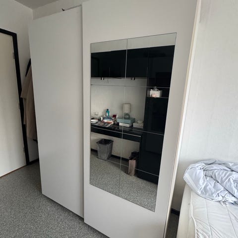 IKEA garderobeskab med skydelåger i hvid. Deassembly not included. Doors and drawers must be removed to get out of apartment building. Truck recommended for pickup