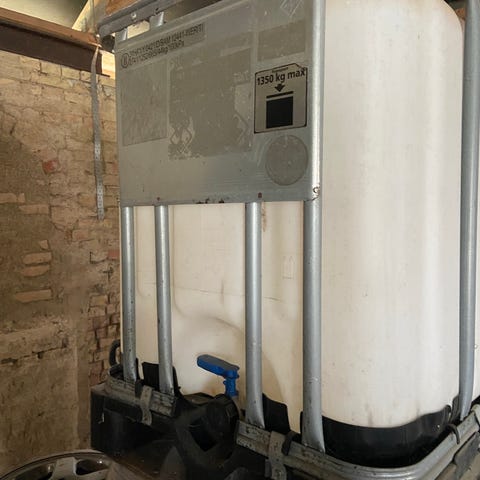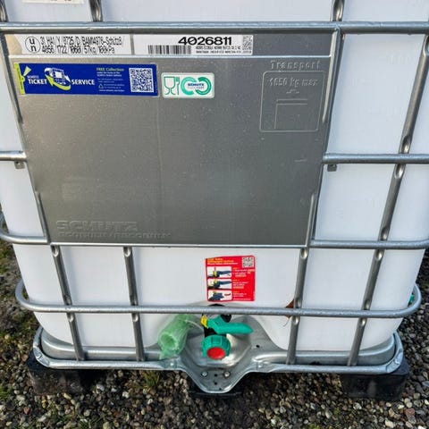 Kingspan miljøcontainer plast tank i grøn. Tank beregnet til opbevaring af væsker, f.eks. olie eller brændstof, med integreret måler og påfyldningsstuds på toppen. Fremstillet i robust plast med forstærkede sider og adgangsrum i midten til tilslutninger og service. Egnet til udendørs placering på fast underlag. Serienummer- og typeplade fra Kingspan Miljøcontainere A/S er monteret på siden af tanken.
