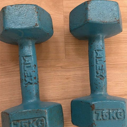 Håndvægte, justerbare, med vægtskiver i plastbelagt materiale.