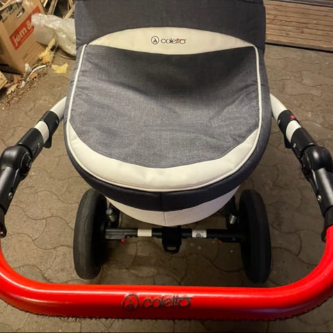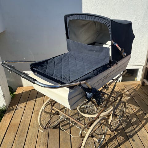 Babynor Ydun barnevogn med liggedel i grå tekstil. Vognen har stor kaleche med lynlåsåbning og justerbart håndtag. Liggedelen har blød madras og frontklap for læ. Stellet har fire hjul og varekurv under vognen til opbevaring.