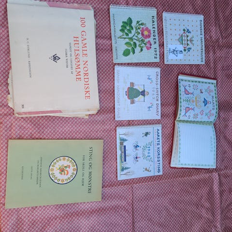 Mønsterark samt nogle sider fra månedsmagasinet Alt om Håndarbejde med broderimønster / tællediagram samt arbejdsgang til et par navne klude samt nogle motiver fra en gammel navneklud broderet i korssting.