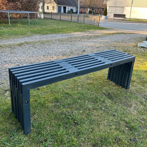 trallebænk bænk i sortmalet træ med en længde på ca. 138 cm. Bænken har et enkelt, slankt design med lameller og kan bruges på altan, terrasse eller i haven som siddeplads eller afsætningsbænk.