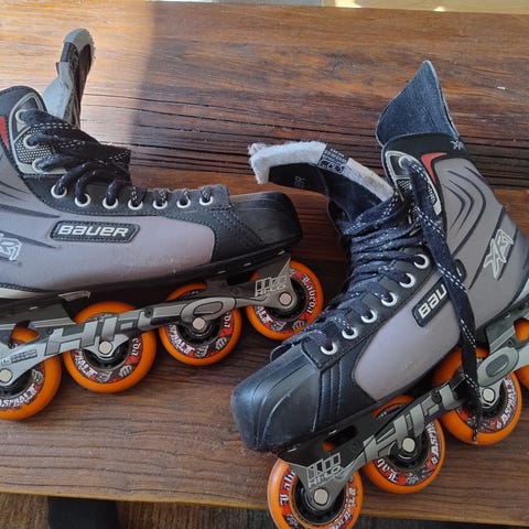 Et par fede vintage Bauer RH 300. De er udviklet til rullehockey, men kan sagens også bruges til almindelig rulleskøjtning. Bagbremse på højre skøjte og stadig med de originale Bauer hjul.