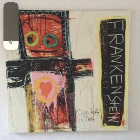 Maleri af Poul Pava med krondyr motiv i ramme. Billedet viser et stiliseret krondyr med teksten "KRONDYR" øverst. Farverne er primært gul, rød, sort og grøn på lys baggrund. Ydermålene er ca. 70 x 90 cm inklusiv ramme. Velegnet i stue, gang - sommerhuset eller børneværelse.