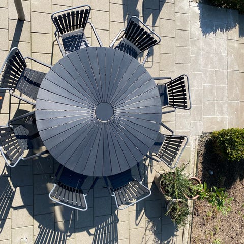 Havemøbelsæt fra Bilka, af navnet Kerteminde. Bordet måler 180×90. Med seks stole. Bordplade og sæder/ryglæn er udført i materiale med trælook (nonwood) i lys træfarve, mens stellet er i hvidt metal. Sættet er egnet til udendørs brug i have eller på terrasse og giver siddepladser til seks personer omkring bordet.