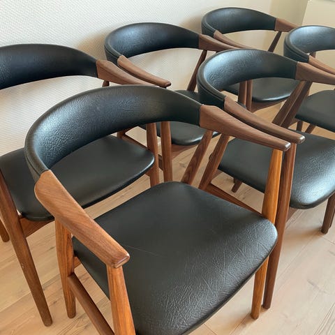 4 stk der alle har stempler. Nyt betræk, som er lidt mere beige/sandfarvet end det ser ud til på billedet. Forventelige brugsspor på stel.