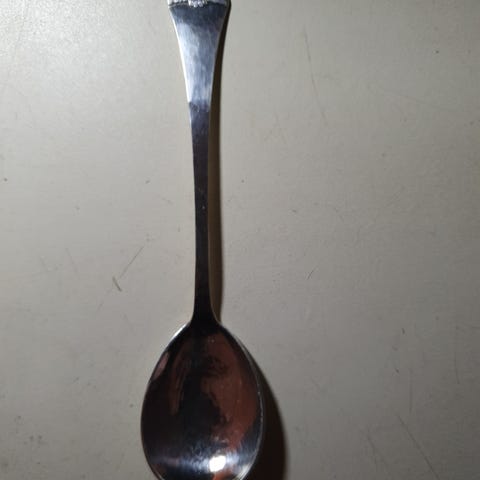 Sølvfarvet ske med reliefmotiv af Tommeliden