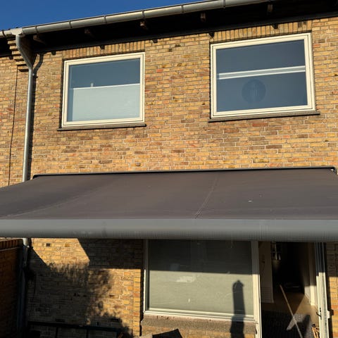Elektrisk markise i sort (med fjernbetjening). Brugt, men i god stand og fungerer upåklageligt.