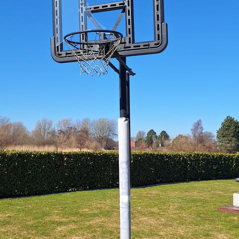 Rigtig god kvalitet basketkurv med justerbar højde 230-305 cm og hjul. Base fyldes med vand eller sand. Alt virker som det skal men lidt rust hist og her da det jo har stået ude.
