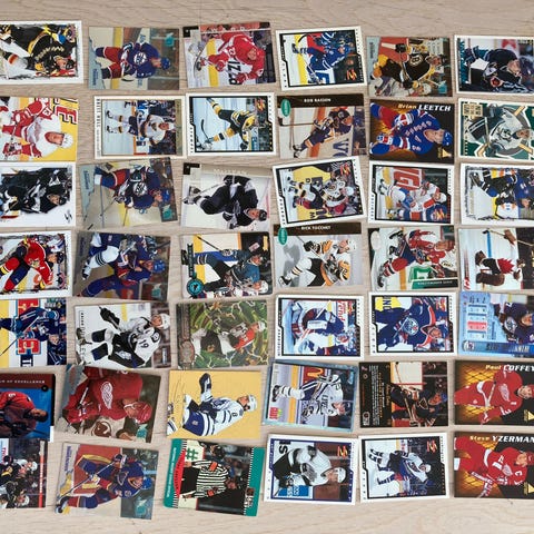 Hockey Collectors trading cards samling ishockeykort i mapper og æske. Samlingen omfatter forskellige ishockeykort fra flere serier og årgange, herunder standardkort, kort med sølv- og guldlook samt kort med holografiske og glansfulde effekter. Kortene er opbevaret i plastlommer i ringbind samt løst i en æske. Velegnet til samlere af ishockeykort, der ønsker en blandet samling med mange forskellige spillere og designs.