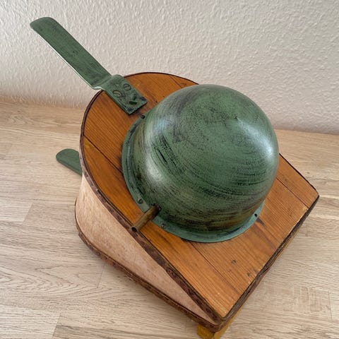 Gammel håndblæsebælg til pejs eller esse i træ og patineret læder med jernrørsstud. Dekoreret med sømmønster på forsiden og lille kæde. To luftindtag i bagsiden. Fungerer stadig. Tydelige aldersspor på læder og træ – giver et autentisk rustikt udtryk. Formentlig dansk eller europæisk håndværk fra 1800-tallet. Fin som dekoration ved pejs.