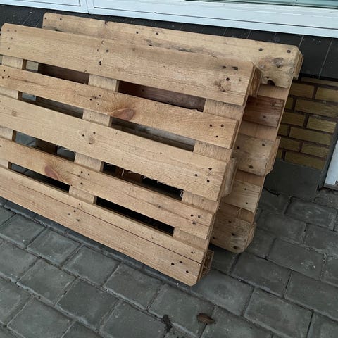 Træpaller i standard europalle-størrelse. Egnet til opbevaring, transport eller gør-det-selv projekter som møbler og indretning. Pallerne er af træ og stablet som vist på billederne.