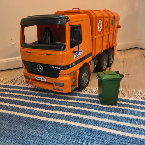 Med denne skraldebil kan du lege, at du er skraldemand. Den har et fuldt fungerende løftesystem, som løfter affaldstønderne op, samt en beholder, der kan åbnes og tømmes.
