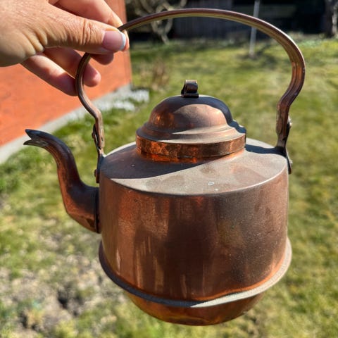 Kobber tekande med fast hank og låg. Tekanden har klassisk tud og kugleformet knop på låget. Velegnet som køkkenredskab eller dekorativ genstand i indretningen.