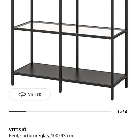 IKEA reol i sort metal med glas hylder. Reolen er designet af Alberto Meda og består af et åbent, rektangulært stel med flere niveauer til opbevaring og udstilling. Konstruktionen er i metal med gennemsigtige glas hylder, som giver et let og luftigt udtryk og gør den velegnet til brug som rumdeler eller vægstående reol i stue, kontor eller andre opholdsrum. Reolen giver plads til bøger, dekoration, elektronik eller andre genstande, der ønskes synligt placeret.