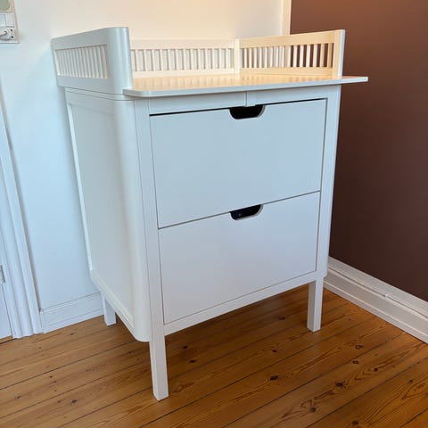 Sebra puslekommode i grå. Kommoden har pusleplads øverst med høje kanter hele vejen rundt. Under puslepladsen er der et skab med to låger og indvendige hylder til opbevaring af bleer, tøj og tilbehør til barnet. Velegnet til brug på børneværelset eller i andre rum, hvor der er behov for en fast pusleplads med opbevaring.