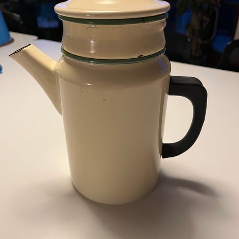 Villeroy & Boch emaljeret kaffekande med tilhørende filterindsats. Kanden er i lyseblå emalje med hank og hældetud samt løs overdel til filtrering. Højden fremgår af billedet med tommestok. Velegnet som kaffekande eller som dekorativ køkken- eller serveringsgenstand.