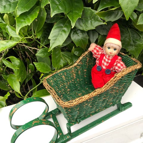 Candy design julefigur med nisse, der ligger i en kane. Figuren forestiller en nisse klædt i vintertøj med hue og halstørklæde, placeret i en grøn kane med rød kant og sort metalstel. Velegnet som julepynt og dekoration på bord, hylde eller vindueskarm i december.