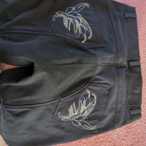 Ridebukser med fuldgrip i sort fra Montar i str 36. Bukserne har silikonegrip på hele sædet og langs indersiden af benene for bedre greb i sadlen som intet fejler. Klassisk linning med bæltestropper, knap- og lynlåslukning samt forlommer. Smal benafslutning med net for mere åndbare samt elastik indsats ved anklerne for god pasform i ridestøvler. Velegnet til ridning og staldarbejde.