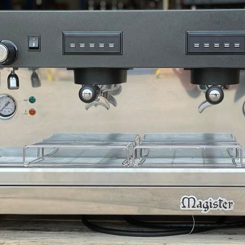 To-gruppes espressomaskine i høj udgave i renoveret stand. Maskinen er blevet afkalket, og kedlen er isoleret.