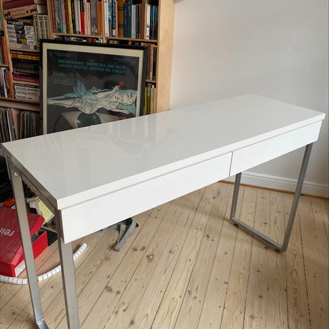 Hvidt skrivebord i god stand men der er nogle få skrammer i bordpladen.