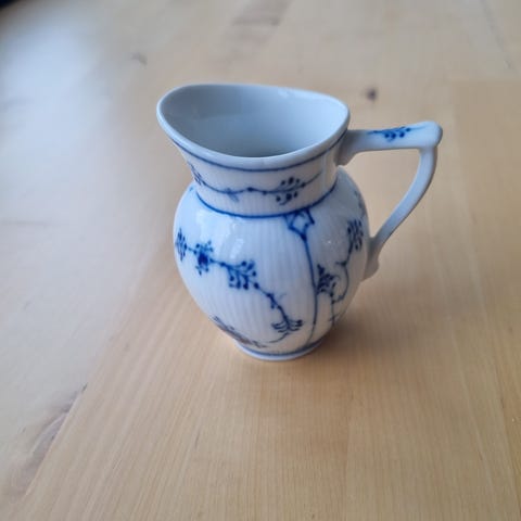 Jeg keder ikke mærket, men det er stemplet Musselmalet kande i hvidt porcelæn med flerfarvet blomsterdekoration rundt om korpus. Kanden har hank med reliefdetaljer og guldkant langs åbningen. Velegnet som serveringskande eller som dekorativ genstand i hjemmet.