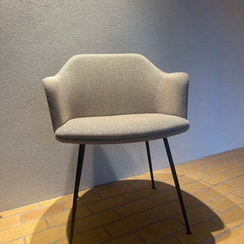 En ikonisk stol med de karakteristiske åbne armlæn og bløde, skulpturelle former. Betrukket med grå stof og med sortlakerede ben i metal. ✨
