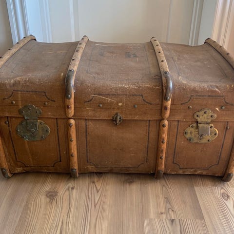 Vintage rejsekiste i træ og metal i blå og brune nuancer. Kisten har buet låg med metalbånd og træstivere samt sidehåndtag. Indvendigt er den foret med papirbeklædning. Egnet til opbevaring eller som dekorativt møbel i boligindretning. Ingen nøgle synlig på billederne. Kan bruges som bar skab. Kom med bud. Skal vaskes af.