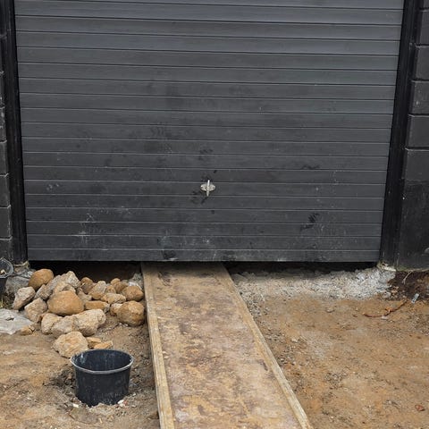 Vi er i færd med at montere en traditionel trædør i stedet for hæve-sænke porten, som det kan ses på billederne.