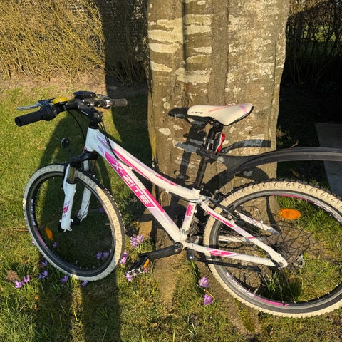 MBK mountainbike i unisex-design med XS stelstørrelse og 26" hjul. Cyklen har affjedret forgaffel, fladt styr og brede dæk, som egner sig til kørsel på både grus og asfalt. Rammen er udført i en let konstruktion med skråt overrør, der giver lav indstigning. Drivlinjen er enkel med ét forreste tandhjul, kædetræk og platformpedaler. Cyklen er velegnet til mindre voksne eller større børn, der ønsker en kompakt mountainbike til hverdagskørsel og ture i lettere terræn. Den koster normalt 17500kr og sælger den, til 6500kr da jeg ikke orker at cykle mere