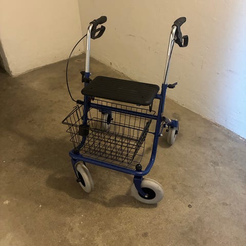 Rollator med sæde og kurv i blå farve. Modellen har fire hjul og håndbremser på begge håndtag. Sædet rillet for bedre komfort, og under sædet er der en metaltrådskurv til opbevaring af indkøb eller personlige ejendele. Rollatoren er egnet til personer med behov for støtte ved gang både udendørs og indendørs. Justerbare håndtag kan tilpasses brugerens højde, og de solide hjul gør den anvendelig på faste underlag som fortov og stier.