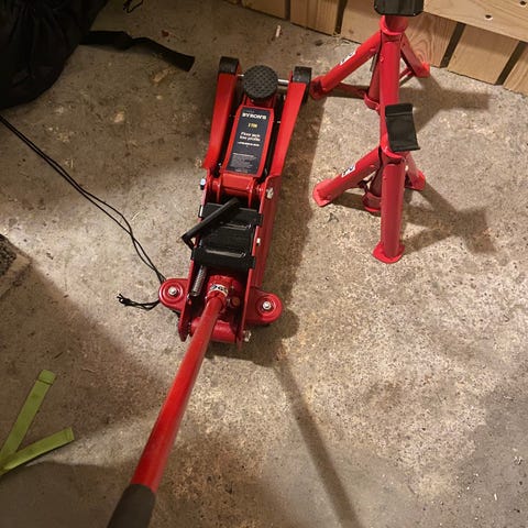 Ukendt mærke støttebukke til bil i rødmalet metal. Sættet består af to justerbare støttebukke med trekantet fod og flad støtteplade med huller. Velegnet som støtte under bil eller trailer ved hjulskift og andet arbejde, hvor køretøjet skal stå stabilt løftet fra underlaget.
