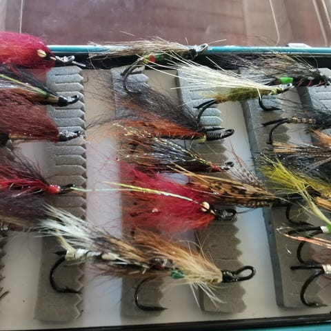 Wheatley alu flueæske købt i London med enkelkroge 39 laksefluer købt i Norge Sverige Finland og Danmark. Nogle nye, nogle brugte, nogle håndbundet, nogle på bestilling efter eget design nogle gænge mønstre, nogle koster 125,- andre 50,-. alle i fin stand sælges samlet 550,-