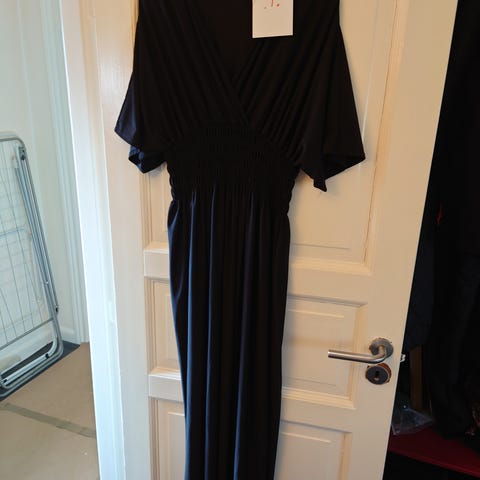 Flot kjole i orange og sort mønster. Kun brugt to gange. Elastisk i stoffet