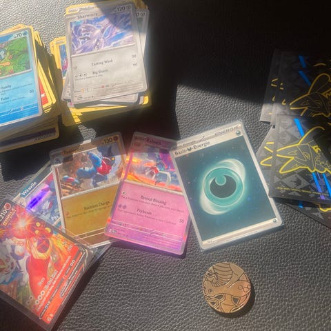 Mvh Ninett Pokémon kort samling med blandede holo- og full art-kort. Kortene viser forskellige Pokémon-figurer fra flere serier og udvidelser. Velegnet til samlere, der ønsker at udvide deres samling med forskellige motiver og varianter. Antallet af kort og specifikke serier fremgår af billederne.