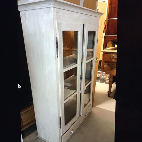 Vitrineskab i træ med to glaslåger og sprosser. Skabet er malet i en lys, hvidlig nuance og har profileret top og sider. Foran er der et mørkt metalgreb og beslag. Indvendigt er der flere hylder, som egner sig til opbevaring og udstilling af f.eks. glas, porcelæn eller pynt. Skabet er velegnet til brug i stue, spisestue eller køkken-alrum som opbevarings- og udstillingsmøbel.