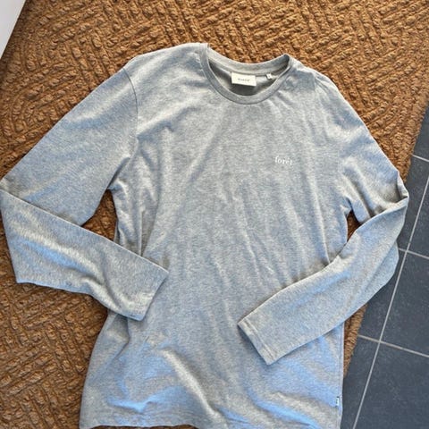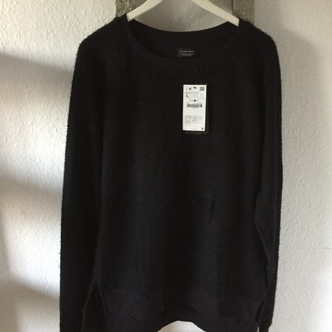 Ny mørkegrøn bluse med rund hals, lange ærmer, ribkant på ærmer + ved halsen. (Lyset dårligt på foto)